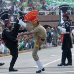 دقایقی بعد نیروهای نظامی و گارد ویژه تشریفات مرزی نیز وارد میدان می‌شوند، مردم این نظامیان را مانند قهرمآن‌های ورزشی تشویق می‌کنند، وآنان نیز تمام انرژی خود را برای نشان دادن قدرت و صلابت کشورشان درگام‌های کوبنده خود سرازیر کرده و زمین را زیر نعره‌های خود می‌لرزانند. آرایش نیروهای تشریفاتی دو کشور به قدری خاص است که نمی‌توان نظیر آن را در جای دیگری یافت، در بخش پاکستان لباس‌های سیاه رنگی را به تن نظامیان می‌بینی که هیبت آنان را دو چندان می‌کند، آنان حین انجام مراسم کوچکترین لبخندی نمی‌زنند و حین قدم زدن اوج گرفتن گام‌ها را تا فراز سرشان بالا می آورند تا آمادگی بالای خود را به نظامیان آن سوی مرز نشان دهند.